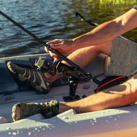 The Lifetime Stealth Angler Kayak, in a striking Eclipse Fusion color, is designed for the dedicated angler seeking comfort and efficiency on the water. With its adjustable padded seat and multiple footrest positions, it ensures hours of comfortable fishing. The kayak’s high-density polyethylene construction is UV-protected, promising durability and resilience against the elements. Smart Flow Scupper Holes expertly manage water drainage, while the skeg wheel enhances tracking and facilitates easy transport. Offering a Triple Threat Fishing Configuration with two flush mount and one deck mount rod holder, it caters to serious fishing enthusiasts. The hull design guarantees ultra stability and excellent tracking, while convenient storage solutions like the beneath-deck hatch and rear tankwell with bungee lacing keep gear secure and accessible. Effortlessly portable with four carry handles, this sit-on-top fishing kayak is your perfect companion for memorable fishing adventures.