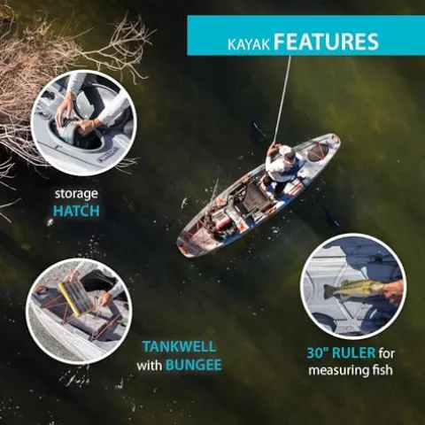 - Kayak Includes Quick-Dry Foam-Back Mesh Seat | Water-Resistant Oval Storage Hatch | Comfort Seating Design Is Easy to Adjust | Ready to Fish – Triple Rod Holder Design