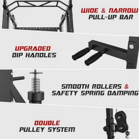 The Liksodo Smith Machine for Home Gym is your comprehensive fitness solution, expertly crafted with a robust 2×2″ steel tube frame, capable of handling up to 2000 lbs, ensuring durability and enhanced safety. This multifunctional power cage integrates eight essential workout stations, including a cable crossover system, lat pulldown, low row station, and more, all within a compact design that fits effortlessly into your home or garage. Its smooth-gliding Smith bar and 86″ pull-up bar elevate your strength training routines, while the 360° landmine attachment supports versatile workout options. Perfect for workout enthusiasts, this all-in-one machine offers limitless exercise possibilities in a convenient and space-efficient setup, making it an indispensable addition to your home gym.