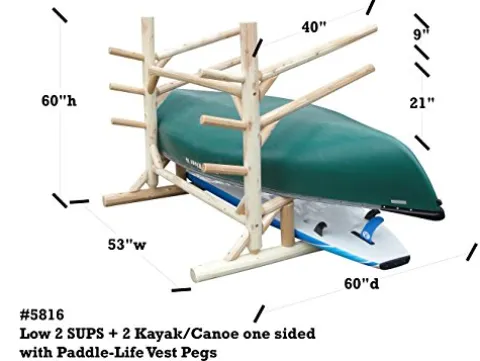 The Log Kayak Rack Low 2 SUP Plus 2 Kayak Rack in Canyon Brown is a sturdy and practical storage solution for your water sports equipment. This rack, made by Log Kayak Rack, is designed to hold 2 Stand-Up Paddleboards (SUPs) and 2 kayaks or canoes, making it ideal for water enthusiasts with multiple gear. It comes with convenient pegs for hanging paddles and life jackets, keeping your equipment organized and easily accessible. Crafted with glued mortise and tenon joinery in northern Wisconsin, this rack boasts durability and quality. The use of northern white cedar ensures that it can be used both indoors and outdoors. With dimensions of 62″H x 60″D x 53″ W, some assembly is required, but the end result is a reliable and attractive storage solution for your water sports gear.