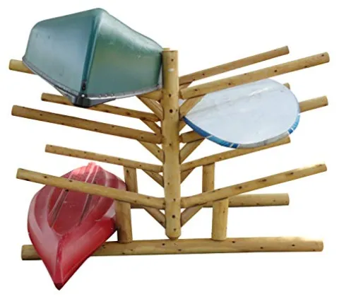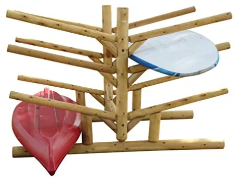 Organize your watercraft collection with the Low 4 Kayak + 2 SUP + 2 Canoe Rack in Canyon Brown by Log Kayak Rack. This sturdy rack is crafted with glued mortise & tenon joinery in Wisconsin, USA, using Northern White Cedar suitable for both indoor and outdoor use. The low-style rack accommodates 4 kayaks on top, 2 SUPs in the middle, and 2 canoes at the bottom, providing a space-efficient storage solution for your aquatic gear. With dimensions of 57″H x 84″D x 77″W, this rack offers ample space while adding a touch of rustic charm to your storage area. Handcrafted in Manitowish Waters, WI, this rack is a durable and practical choice for organizing your watercraft assortment.