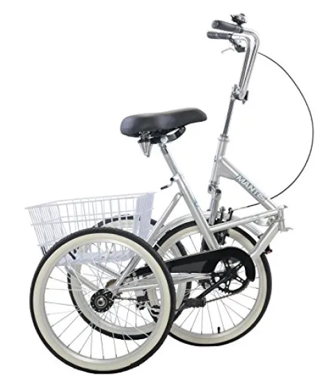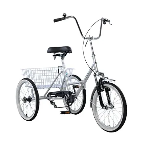 The Mantis Tri-Rad 20 Inch Wheels Single Speed Adult Folding Tricycle in Silver offers a convenient and comfortable ride for adults. This tricycle features a folding steel frame with a steel suspension fork, ensuring durability and smooth handling. The aluminum rims with 20 x 1.75 inch white wall Kenda tires provide a sturdy grip on various terrains. With a single-speed drivetrain and one-piece crank, this tricycle is easy to use and maintain. The front v-brake with parking brake, easy adjust steel stem, and large comfort saddle enhance the overall riding experience. Additionally, it comes equipped with practical accessories such as a front fender, rear basket, parking brake, bell, and chainguard, making it a versatile choice for leisurely rides. Folded dimensions of 35″L x 30″W x 31″D ensure convenient storage and transportation when not in use.