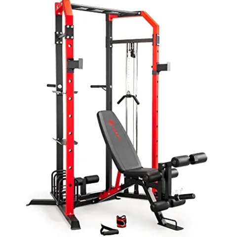 Enhance your home gym with the Marcy Power Cage System featuring the adjustable weight bench SM-7393. Designed by MARCY in a versatile multi-color, this system offers a comprehensive workout experience. The adjustable bar catches cater to users of all sizes, facilitating easy barbell racking post-workout. With included dip bars for triceps and chest training, heavy-duty leg anchors for lower body development, and a pull-up station offering various grip positions, this system ensures a full-body workout. Sturdy construction and comfortable foam grips make this system a durable and practical choice for your fitness routine. Please note that assembly is required, and this model ships in multiple boxes for your convenience.