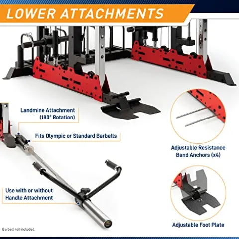 - MULTIPLE EXERCISE OPTIONS – The SM-7553 offers a wide variety attachment for more workouts. Attach the landmine station for landmine squats and leg press attachment for leg presses. The resistance band / tube anchor rods can add even more resistance to your workouts as well (resistance bands / tubes not included).