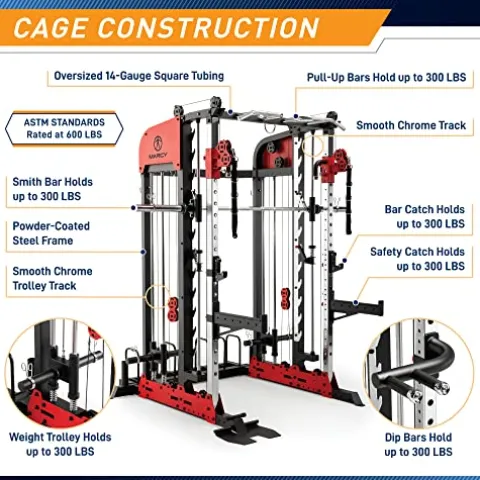 - ALL-IN-ONE HOME GYM – The SM-7553 Deluxe Smith Cage Home Gym also includes traditional power tower features. Use the adjustable dip station for dips, or the multi-grip pull up station for pull-ups, chin-ups, and more. The row plate on the SM-7553 helps provide grip for your seated rows.