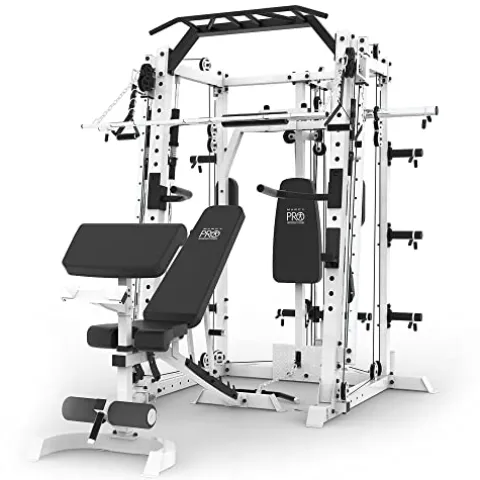 The MARCY Smith Machine Multi Purpose Training Cage by MARCY in white is a versatile gym system that consolidates multiple strength-building machines into a single unit for a comprehensive full-body workout. Constructed from heavy-duty steel with a powder coating, this training cage is durable and adjustable, featuring a bench that can be customized at the back pad and seat pad. With ample space for exercise routines and a weight capacity of 300 pounds, it offers flexibility and mobility during workouts. Additionally, the included features like adjustable dip bars, cable handles, landmine attachment, and triceps rope enhance the variety of exercises that can be performed. Ideal for those looking to optimize their strength training regimen, this training cage measures 70 x 84 x 86 inches, providing a complete workout solution in one space-efficient package.