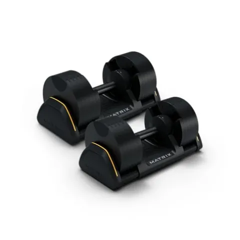 Elevate your home workout with the Matrix Fitness DB50 50 lb. Adjustable Dumbbells. Offering versatility and space-saving convenience, these dumbbells feature a handle twist mechanism that lets you adjust the weight in 5 lb. increments, effectively replacing 10 traditional dumbbell pairs. The knurled metal handle ensures a secure grip, while the flat-bottom weight plates prevent unwanted rolling. Sleek in black, these dumbbells come with sturdy cradles for easy storage, and an optional rack is available for purchase to enhance organization. Ideal for both beginners and seasoned lifters, the DB50 set delivers a premium gym experience right in the comfort of your home.