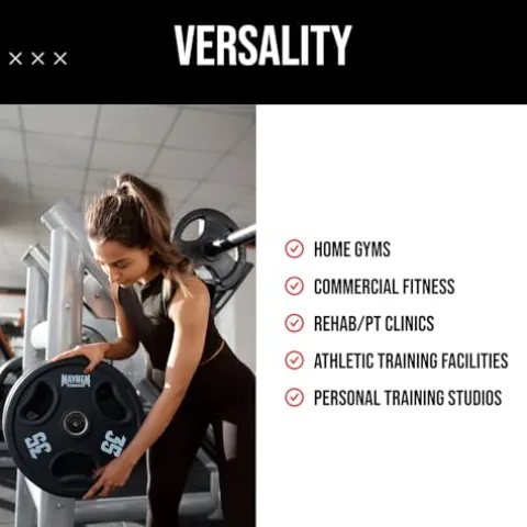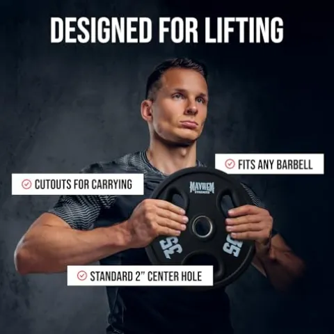 - EASY TO USE DESIGN – Our Mayhem Strength V3 Urethane Plates are a high-quality, durable option made from polyurethane to stand up to any workout. Each plate has a cutout to allow users to grip the plates for transport. The 2-inch center hole perfectly fits any standard barbell for a secure and comfortable workout experience, no matter how heavy your bars are loaded.