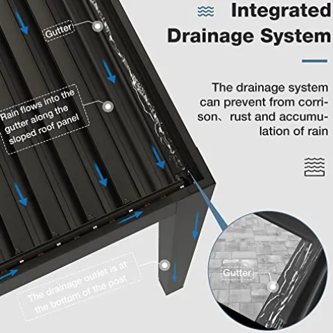 - 🌨️Well-Designed Drainage System – This outdoor louvered pergola is designed with a built-in gutter which can collect raindrops from each panel and export them all the way down to the bottom of the post, effectively avoiding rain to accumulate on the top and at the same time this drainage process is going mildly and will not affect user experience.