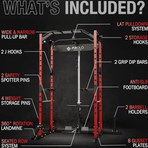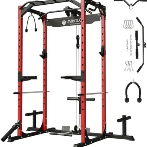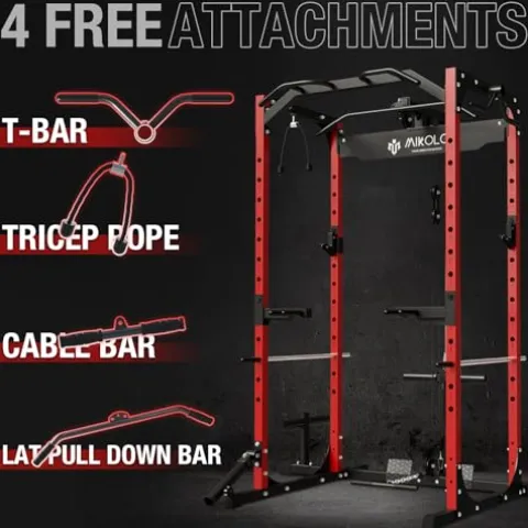 The Mikolo Power Cage, Power Rack in striking Red color, is a versatile workout cage designed for home gyms. With a 1200-pound capacity and constructed from heavy-duty 2×2-inch commercial steel tubing, this F4-301 model provides stability and durability for a wide range of exercises. The machine comes fully equipped with various attachments, including handle attachments, safety spotter pins, dip bars, and more, offering comprehensive workout options like lat pull-downs, rows, bench presses, and squats. Despite its robust features, the compact design of the F4 saves space while providing ample storage options with weight storage pins, barbell holders, and handle storage hooks. This power rack also boasts comprehensive upgrades such as adjustable heights, reinforced dip bars, and secure weight plate holders, making it a top choice for fitness enthusiasts looking to elevate their home workout experience.