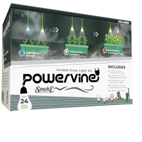 The Miracle LED Smokephonics Powervine Seed to Flower Indoor Grow Light Kit offers a comprehensive solution for indoor gardening enthusiasts seeking optimal plant growth from seed to bloom. This versatile kit includes one blue, two full spectrum, and one red spectrum 150W replacement grow light bulbs, strategically designed to support each stage of the growing cycle. Start with the blue spectrum for seedlings, transition to full spectrum for lush growth, and finish with the red spectrum to enhance flowering and fruiting, all while minimizing energy costs to just $1.32 per year. With the included 2-socket corded fixture, this multi-spectrum kit not only promotes healthy plants but also provides an energy-efficient lighting solution that fits seamlessly into any indoor space.