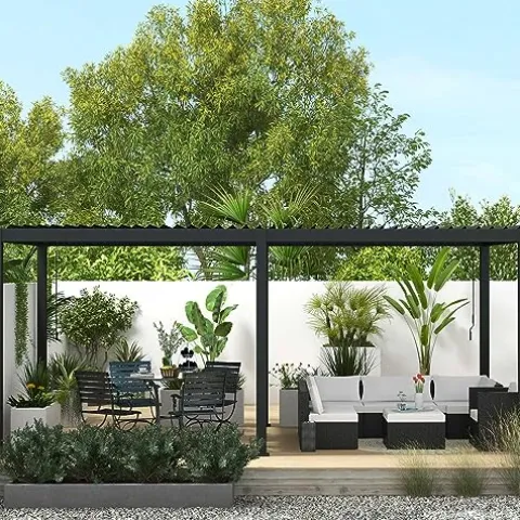 The MIRADOR 111DA Louvered Pergola is a striking blend of modern design and functionality, perfect for enhancing any outdoor space. With its sleek charcoal finish and award-winning design featuring clean lines and invisible fixings, this pergola not only elevates the aesthetic of your garden, poolside, or rooftop but also offers practical benefits. Constructed from durable, weatherproof aluminum with a double-layer louver system, it effectively shields against rain and snow while providing exceptional sound dampening and heat blocking. The bioclimatic roof allows for effortless adjustment, giving you control over sunlight and ventilation with a simple crank mechanism. Easy to assemble without special tools, the Mirador pergola is designed for both intimate moments and vibrant gatherings, making it the perfect addition to create cherished memories in your outdoor sanctuary.