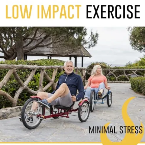 - Low Impact Exercise – Get a cardiovascular workout with minimal stress on your back and knees. Reclined seat provides evenly cushioned support. An outdoor tricycle for seniors and all adults who prefer a more stable, comfortable ride
