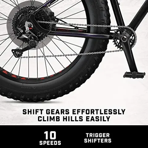 Conquer any terrain with the Mongoose Argus Sport Adult Fat Tire Mountain Bike. This sleek black bike features a Tectonic T2 aluminum frame that combines strength with lightweight agility for a responsive ride. Equipped with a 10-speed derailleur and shifter, this bike effortlessly adapts to various terrains. The hydraulic disc brakes deliver reliable stopping power in all weather conditions, while the large 26 x 4.8-inch tires ensure maximum traction, even on snow or sand. With internal cable routing for a clean look and added protection, this bike is perfect for riders 5’7″ to 5’10” seeking adventure and performance.