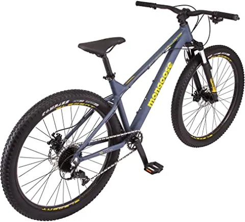 Conquer rugged mountain trails with the Mongoose Colton Adult Mountain Bike in Slate Blue. Featuring a durable aluminum frame with progressive trail geometry and 27.5-inch wheels suitable for riders 64 to 74 inches tall, this hardtail bike is perfect for off-road adventures. The 7-speed drivetrain ensures smooth gear changes, while the suspension fork and mechanical disc brakes offer reliable performance. With wide knobby tires for added grip and stability, and alloy double wall rims for lightweight strength, this bike is designed for maximum fun and control on challenging terrains.