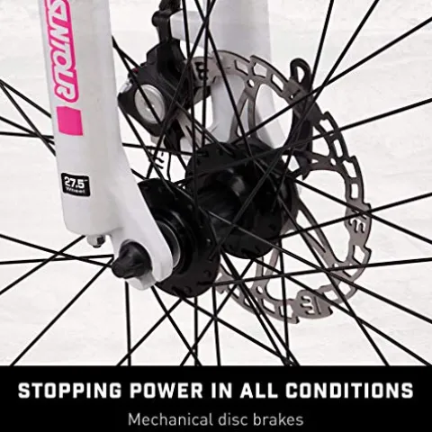- 27.5-inch wheels with Mongoose 2.1-inch wide tires for all-terrain adventures.
