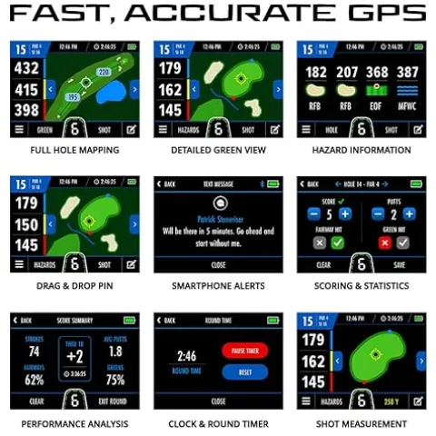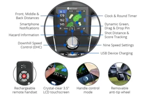 - TOUCHSCREEN GPS & BLUETOOTH: Features a 3.5″ LCD Touchscreen GPS with 40,000 pre-loaded courses for accurate shot measurement, real-time updates, advanced analytics tracking, and dynamic green view, helping you make more informed shots to take your game to the next level. Connect to your phone via Bluetooth to receive calls, texts, emails, and more. Does everything but hit and find your ball.