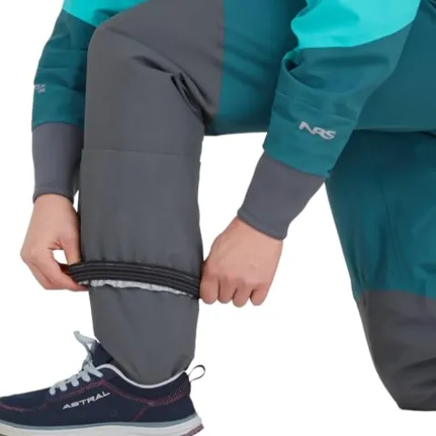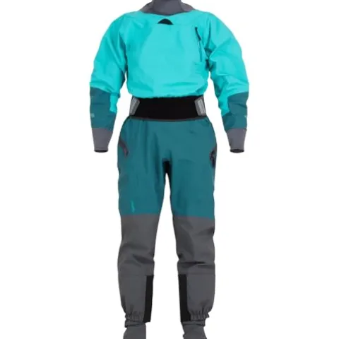 The NRS Women’s Phenom GORE-TEX Pro Dry Suit in Aqua, XS offers top-tier protection for water sports enthusiasts. Crafted with 3-Layer GORE-TEX Pro fabric, this dry suit ensures waterproof, windproof, and breathable performance. Its eco-conscious design features recycled fabric for minimal environmental impact. The neoprene waist overskirt with a hook-and-loop closure provides a tailored fit and excellent seal against water. With a back-entry zipper and protective flap, this suit minimizes bulk, enhances mobility, and prevents water from pooling, making it an ideal choice for staying dry and comfortable during aquatic adventures.