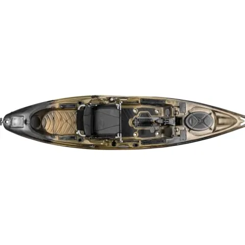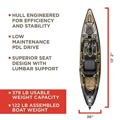 The Old Town Sportsman BigWater PDL 132 Pedal Fishing Kayak in Marsh Camo is the ultimate choice for open water anglers and tournament fishing enthusiasts. With its intuitive forward/reverse pedal drive, this kayak offers seamless, hands-free navigation, perfect for focusing on the catch. It boasts customizable accessory tracks, cushioned floor pads for enhanced comfort, and a custom tackle box, making it a fisher’s dream. The premium mesh seat provides exceptional lumbar support and adjusts easily, ensuring comfort for all-day adventures. With a robust 500-pound capacity, ample storage options including a large stern tank well and sealed bow hatch, and a universal transducer mounting system for easy fish finder installation, this 13-foot kayak perfectly balances functionality and comfort. Whether storing a cooler or securing your paddle with the side-mounted clip, the BigWater PDL 132 is designed to elevate your fishing experience.