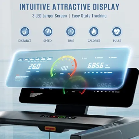 - 【Multi-functional LED display & with 36 preset programs】Easy-to-read display with large and intuitive interface to track your speed, time, distance, calories burned and pulse.36 preset programs, 3 user manuals and 3 manual incline settings provide challenging variations to make your training more effective. Built-in armrests for easy one-touch control.
