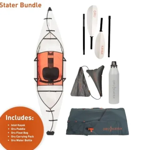- ALL THE ESSENTIALS FOR ANY PRO: Oru Fiberglass Paddle – with asymmetrical blade for a high-performance pull through the water and breaks down into four pieces for easy storage. Gel Seat – an EVA foam upper and gel insert below molds to your body shape to provide comfort. Oru Pack – made of rugged heavy-duty nylon, with a comfortable shoulder and hip strap system. Float Bags – Made of abrasion and puncture-resistant coated nylon. Oru 24 oz Water Bottle – with double-wall insulation.
