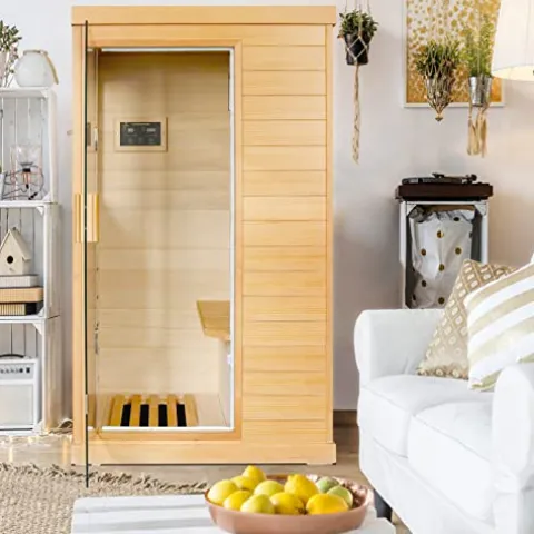 Transform your home into a personal wellness retreat with the OUTEXER Far Infrared Sauna, crafted from premium Canadian Hemlock wood known for its durability and excellent heat insulation. Its compact design, measuring 35.2 x 27.6 x 61.6 inches, is perfect for indoor spaces, while the tempered glass door ensures longevity. Experience the multitude of health benefits from the 800W far infrared spa, featuring five ultra-low EMF heating panels and a separate foot heater for ultimate comfort. The sauna’s intuitive control panel allows precise temperature adjustments between 68°F and 140°F, with safety features like automatic temperature regulation and a timer. Enjoy your favorite entertainment through the built-in Bluetooth speakers, all while benefiting from a product backed by a seven-year after-sales service and straightforward installation. Upgrade your relaxation and wellness routine with this elegant and efficient sauna experience.