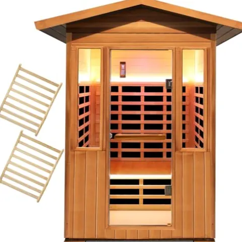 Experience the ultimate relaxation with the OUTEXER Outdoor Sauna Far Infrared Sauna Room. Designed for two people, this spacious sauna boasts a powerful 1800W system that quickly heats up to your desired temperature range of 68°F-140°F. Crafted from high-quality Natural Red Cedar and Canadian Hemlock wood, this sauna emits a natural wood fragrance and offers excellent insulation. The sauna’s health benefits include lowering blood pressure, detoxifying the body, and improving circulation. Control the sauna with ease using the smartphone app and enjoy the eight energy-efficient heating panels that surround your body. With LTL CURBSIDE & SIGNATURE REQUESTED shipping and 24-hour after-sales service, this sauna promises a luxurious and stress-free experience from start to finish.