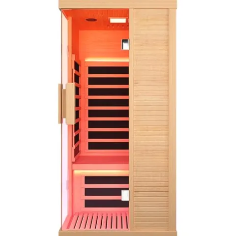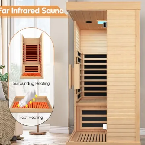 Elevate your wellness routine with the OUTEXER Indoor Far Infrared Sauna, crafted from premium Canadian Hemlock for exceptional durability and style. This single-person sauna is designed for your comfort, featuring a 33.5 x 33.5 x 68.9-inch space complete with cup holders, towel racks, and a sleek glass design. Enjoy the therapeutic benefits of far infrared technology with low-EMF heating panels, reaching up to 149°F. The sauna’s intelligent entertainment system, featuring two high-quality speakers and a seven-color light therapy feature, ensures a relaxing, immersive experience. Safety is paramount with features like dry burn protection and automatic power-off, while the user-friendly control panel allows easy temperature and timer adjustments. With 24-hour after-sales support and simple maintenance, this sauna offers a luxurious escape in the comfort of your home, transforming any space into a personal spa sanctuary.