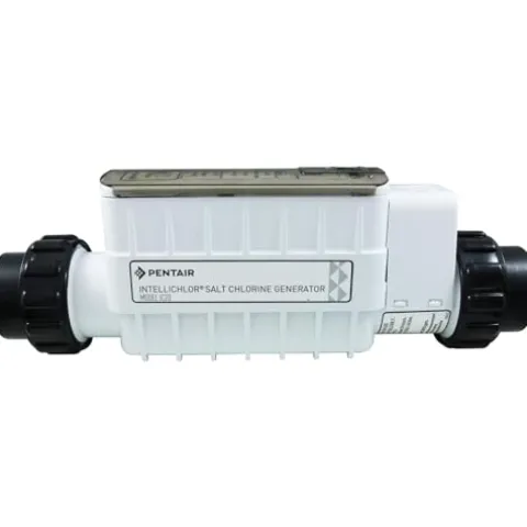 The Pentair EC-520554 Salt-Chlorine Generator in Almond is a reliable and efficient solution for sanitizing pools up to 20,000 gallons. With a chlorine output of 1.40 lbs every 24 hours, this generator ensures clean and safe pool water. Equipped with a built-in control display, monitoring salt levels and sanitizer output is easy. The titanium electrode cell blades coated with ruthenium oxide offer exceptional durability. The 2″ union inlet and outlet connections allow for quick and simple cell replacement. Additionally, the LED indicators and display provide clear visibility, while the threaded unions contribute to energy efficiency and eco-friendly pool maintenance.