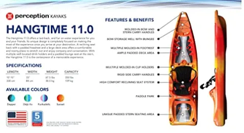 - Innovative Design, Made in USA: Uniquely designed for maximum fun and relaxation on the water, the Perception Hangtime 11 is a recreational kayak that stands out in its category. Proudly designed and crafted in the USA, it’s perfect for paddling on lakes, ponds, and slow-moving rivers.