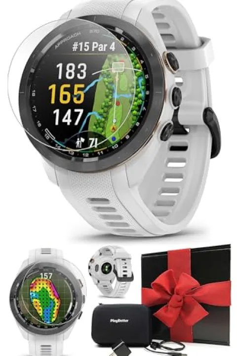 - Ultimate Golfers Gift Box Bundle: Garmin Approach S70 Premium Golf Smartwatch, PlayBetter HD Screen Protectors, USB Charging Adapter for Wall, Protective Hard Case, and USB-C Charging Cable | Packed in Black Gift Box with Red Bow
