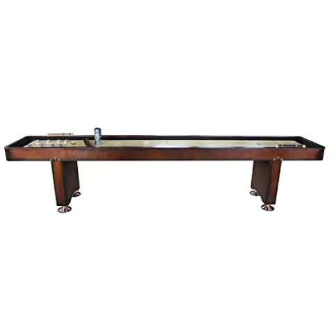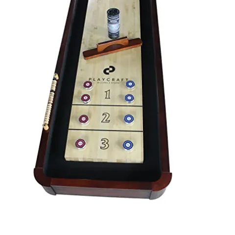 Enhance your game room with the Playcraft Georgetown Shuffleboard Table in Cherry. This 12-foot table by Playcraft features pro style climate adjusters, a solid single stave butcher block playfield with a smooth polyurethane finish, reinforced pedestal legs with metal levelers and storage shelves, and a one-piece cradle and playfield design. The table also includes carpeted walls and gutters for a premium playing experience. With its sturdy construction and sleek design, this shuffleboard table is a perfect addition for both casual and serious players alike.