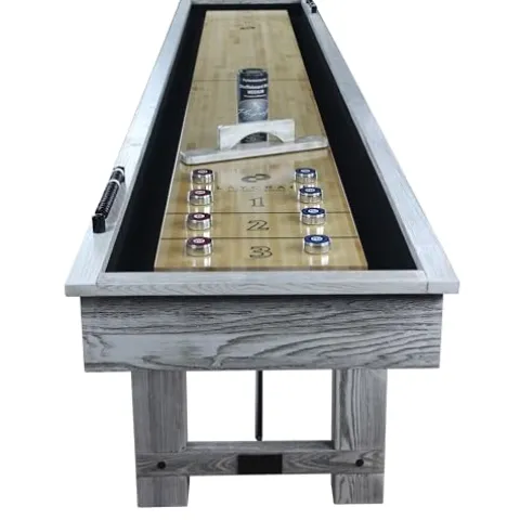 Enhance your game room with the Playcraft Montauk 9′ Shuffleboard Table in stylish whitewash. This table boasts a 5” wide solid hardwood butcher block playfield with a smooth polyurethane finish, ensuring a premium playing surface. Crafted with solid hardwood and black steel turnbuckle hardware, it exudes durability and style. Pro style climate adjusters and adjustable leg levelers provide optimal playing conditions, while the traditional indoor scoring pattern adds a classic touch. The table includes a set of deluxe weights and speed wax for immediate gameplay. Measuring 108″ L x 24″ W x 32″ H and weighing 210 lbs, this shuffleboard table is a must-have for any game room enthusiast.