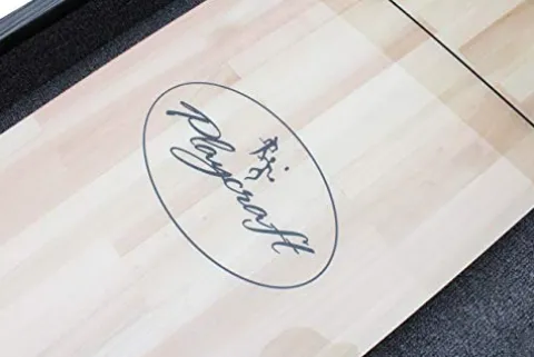 Enhance your game room with the Playcraft Saybrook Midnight 16′ Shuffleboard Table. Featuring an innovative KD design, this table is perfect for rooms with limited access. Crafted with solid hardwood in a weathered Midnight charcoal gray finish, the Saybrook boasts an industrial design with exposed steel hardware. The two-piece solid hardwood butcher block playfield is coated for durability. This set includes a set of 8 deluxe weights, speed wax, and a stain-matched board sweep. With full assembly required and a 1-year warranty, the Saybrook shuffleboard table is a stylish and functional addition to any home entertainment space.