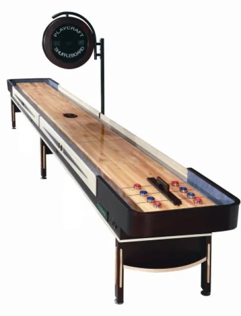 Experience the luxurious gameplay of the Playcraft Telluride Espresso 12′ Shuffleboard Table. Crafted with a beautiful rich furniture quality finish and a Canada Maple edge-glued vertical stave butcher block, this table exudes elegance and durability. Keep track of your score effortlessly with the 24″ electronic scorer featuring a Lexan face. With playing equipment included and easy assembly required, this shuffleboard table is perfect for adding a touch of sophistication to your game room.