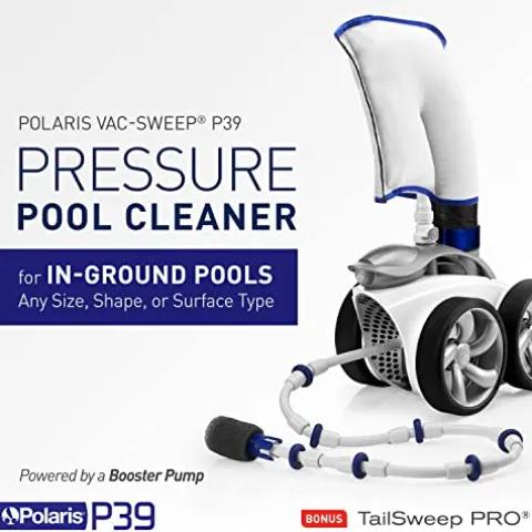 The Polaris P39 Pressure Side Pool Cleaner is a top-of-the-line solution for maintaining the cleanliness of your in-ground pool. This advanced cleaner, designed by Polaris, features an innovative dual chamber zippered SuperBag that circulates an additional 40 gallons of water per minute, ensuring a cleaner and healthier swimming environment. It effectively cleans all pool surfaces, including floors and walls, thanks to its powerful sweeping and scrubbing capabilities. Powered by a booster pump (not included), the Polaris P39 effortlessly picks up debris like leaves, pebbles, and acorns. With its all-wheel PosiDrive system and durable stainless steel drive chain, this cleaner delivers up to 50% more torque for quicker cleaning, improved maneuverability, and fewer snagging points. Keep your pool sparkling with the superior performance of the Polaris P39 Pressure Side Pool Cleaner.