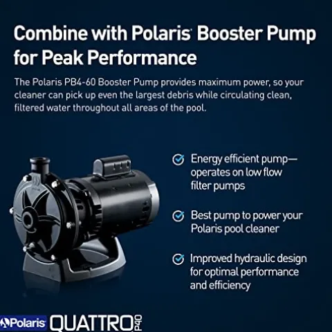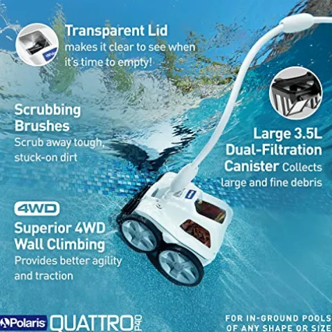 - Scrubbing Brushes Clean Floor to Waterline: The Polaris Quattro P40 easily connects to a dedicated pressure line to sweep, scrub and vacuum your pool from floor to waterline. While cleaning, the Quattro P40 circulates clean, filtered water throughout the entire pool.