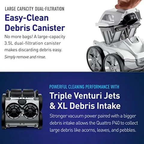 - Extra-Large Debris Intake & Strong Vacuum Power: Three powerful, venturi jet vacuums paired with an extra-large debris intake allows the Quattro P40 to collect large debris like acorns, leaves, and pebbles.