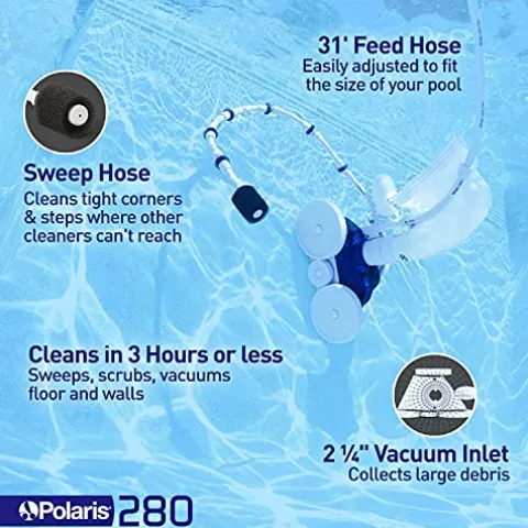 - WHAT’S INCLUDED: Polaris Vac Sweep 280 Pressure-Side Pool Cleaner, 31-feet of feed hose, & single chamber filter bag for capturing all types of common pool debris