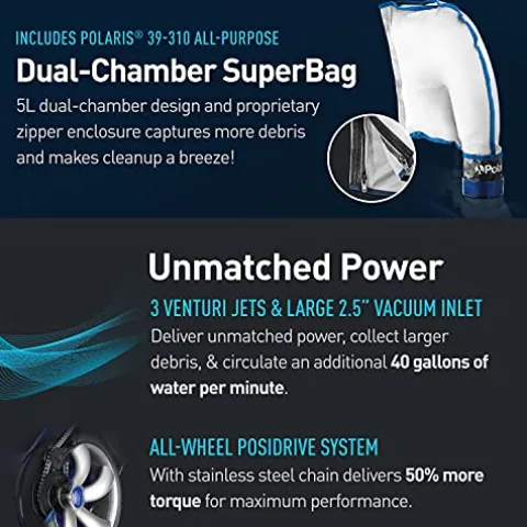 - DUAL CHAMBERED SUPERBAG: The pressure cleaner is equipped with a 5 liter dual chamber filter bag that captures small and large debris such as leaves, acorns, pebbles, and more.