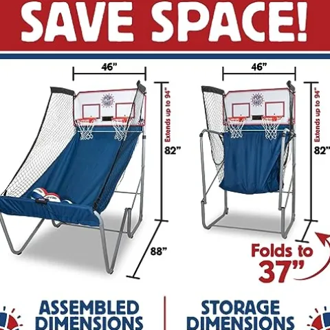 - DURABLE CONSTRUCTION: Made from sturdy 1 ½” steel tubes with a powder coating to eliminate rusting and chipping and a thick nylon ramp, the Home Dual Shot can withstand continual use for years. The frame and backboard are much thicker and sturdier than those of most other basketball arcade games.