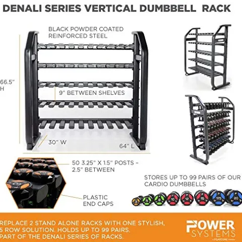 - STORE YOUR POWER SYSTEM BRAND CARDIO DUMMBELLS IN THIS STYLISH SOLUTION – The Denali Vertical Dumbbell Rack gives your space a solidly constructed, dynamic storage unit within the Power Systems exclusive Denali Series of racks. With Denali, you’re getting the signature durable, “rounded” edge design that makes this line of storage solutions the most ergonomical and lasting rack currently available.