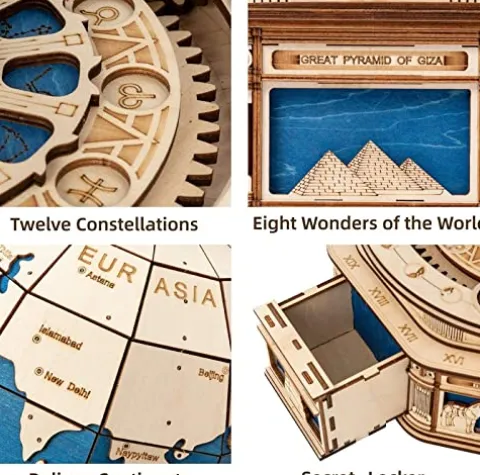 Embark on an engaging journey with the PRODCA 3D Wooden Puzzle Globe, a captivating model kit designed for adults and teens. Comprising 567 intricately crafted pieces, this puzzle offers an immersive 8-hour experience that fosters patience, teamwork, and connection when completed with loved ones. Featuring silk-screen technology, the globe showcases a stunning ocean blue with wood-toned continents, enhanced by patterns depicting the eight wonders of the world. Discover hidden storage spaces amidst the intricately detailed 12 constellations as you rotate the globe, offering an educational exploration of geography, constellations, and architecture. Perfect as an educational gift or a unique pastime, this wooden puzzle is a delightful blend of learning and craftsmanship, promising both challenge and excitement for puzzle enthusiasts.