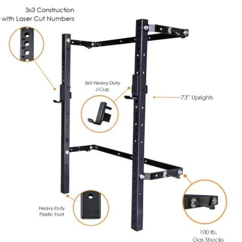 - PATENTED DESIGN: PRx Performance Profile squat racks are a patented design. We are the only manufacture of the fold up squat rack design. Gas shocks located in on each 4 pivot points allows this wall mounted squat rack to be folding up and down with ease. Included is a safety pin to lock the rack in the up position.