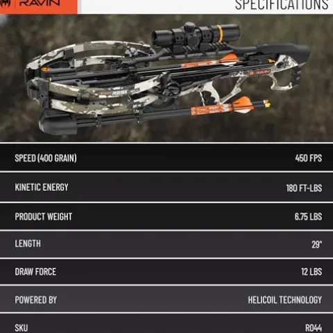 - INCLUDES – 3 Ravin .003 arrows and field points, removable draw handle, scope level and 100-yard adjustable Speed Lock scope