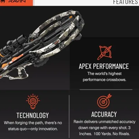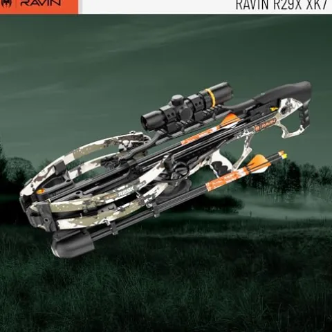 The RAVIN 29X XK7 Crossbow combines cutting-edge technology and superior performance for the ultimate hunting experience. Featuring HELICOIL TECHNOLOGY with a 340-degree cam rotation, this crossbow ensures exceptional accuracy with every shot. The TRAC-TRIGGER FIRING SYSTEM enables silent cocking and perfectly balanced draws, while the FRICTIONLESS FLIGHT SYSTEM enhances target precision. Its KING XK7 CAMO design seamlessly blends into various terrains, providing optimum concealment. This fully assembled package includes three Ravin .003 arrows, field points, a removable draw handle, scope level, and a 100-yard adjustable Speed Lock scope, making it a comprehensive solution for serious hunters.