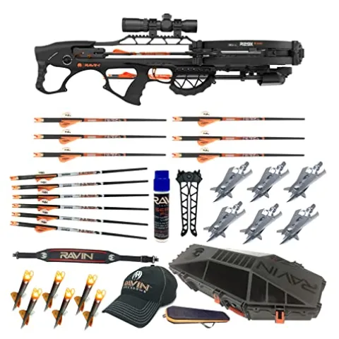 - Bundle Includes: Ravin Crossbows R29X 450 FPS Crossbow Package, Protective Hard Case, .001 400gr. Premium Arrows (6-Pack), 2 x Titanium Broadheads (3-Pack), Arrow Case, Shoulder Sling, 2 x Replacement Lighted Nocks (3-Pack), TacHeads Bi-Pod, Hat, and Serving and String Fluid