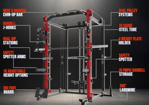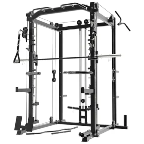 - 【ATTACHMENT INCLUDE】The machine comes with Smith Bar,Dual Pulley,Landmine,Lat Pulldown Bar,J-Hooks,Safety Spotter Arms,Foot Board,Weight Storage,Dip Station, providing a variety of exercises for example Wide & Narrow LAT Pull-down, Landmine Movements, Seated cable row, Bench press, Squat, Dead-lifts, Bicep Curl, Triceps Extensions, Pull-ups, Chin-ups, Dips and more.