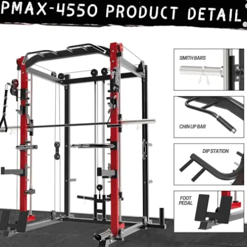- 【6 IN 1 Home Gym PMAX-4550】Compared to other Smiths, It has more complete functions, (1) 6 training parts included to exercise most muscles (2) two non-interfering pulley systems, which means you can Train with your family and friends (3) The trainer boasts a cross-over station which, in combination with the Smith Station, facilitates a comprehensive chest workout. (4) Unbeatable prices, (5) 24 months After-sale warranty service saves you more money.