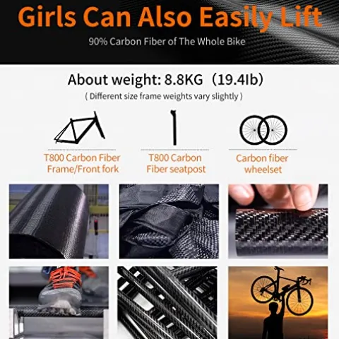 - 【T800 Carbon Fiber Material】Road Bike with Lightweight T800 Carbon Fiber Frame,carbon front fork and carbon seat tube. Weight only 8.8kg (19.4 lb). Under the same volume, the hardness of the material is 5 times higher than that of the aluminum alloy bicycle frame.Lightweight design for this adult bike is suitable for men and women.